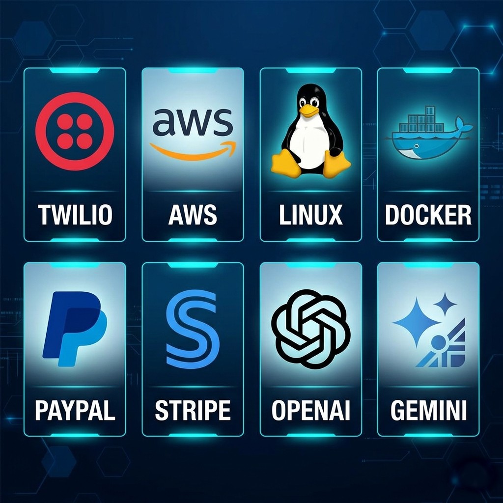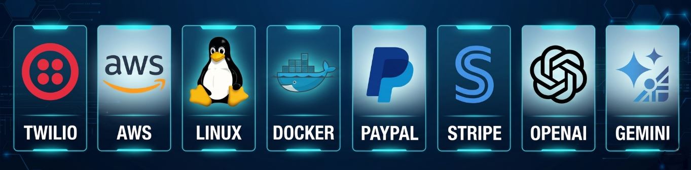 Usamos las marcas más importantes y actuales para el desarrollo de arquitecturas de software, comunicaciones, servidores, pagos en línea, apis de Inteligencia Artificial entre otros.